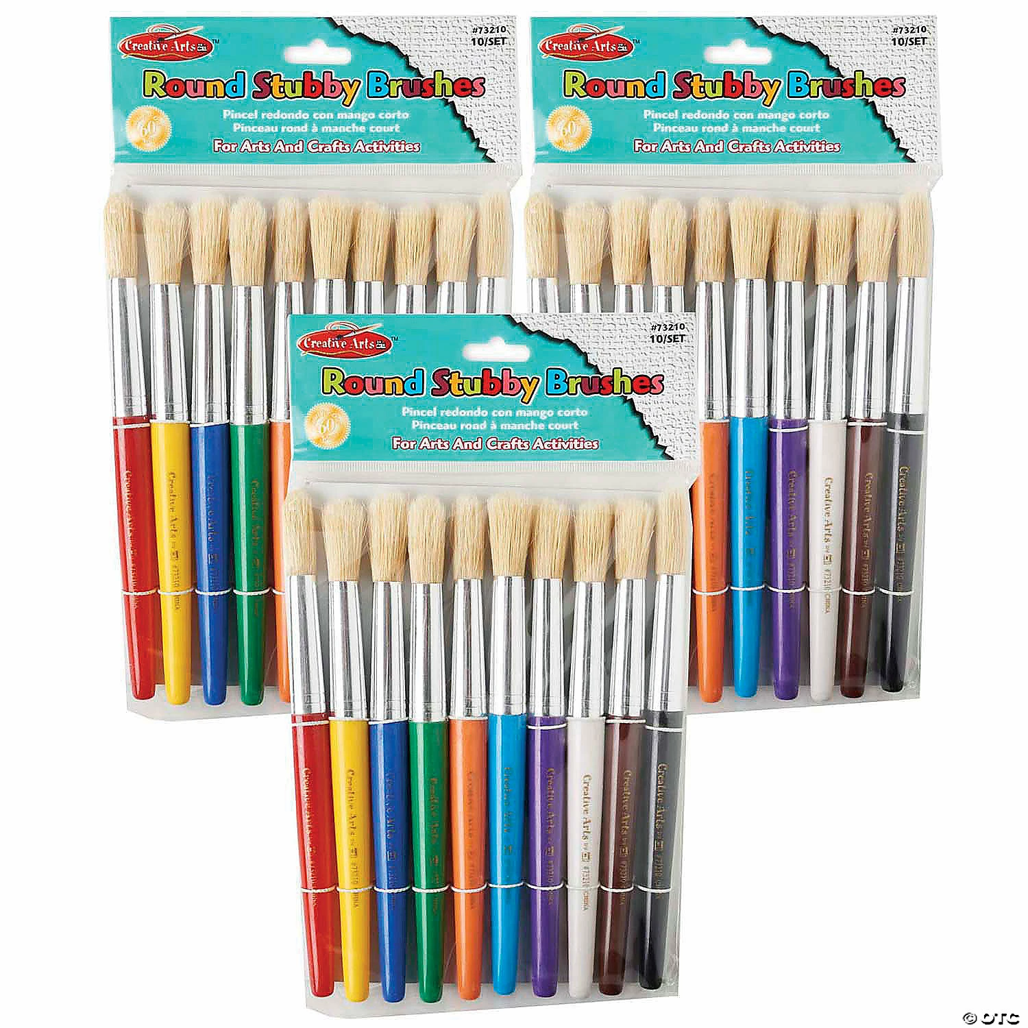Round stubby brushes feature brightly colored 7.5″ plastic handles. Natural hog bristles held in seamless aluminum ferrule. Color coded to match Creative Arts spill proof paint cups. Each pack includes 10 brushes in 10 colors: red, yellow, blue, green, orange, brown, white, black, purple and turquoise. Sold as 3 packs for a total of 30 brushes.Β Β Special Shipping Information:Β This item ships separately from other items in your order.Β This item cannot ship to a P.O. Box.Β This item may be subject to additional processing days.Β Β Item is not eligible for expedited shipping.Β Β Β Β You may initiate a return for unused items within 30 days, if the items are in original packaging with all original materials included with the shipment.