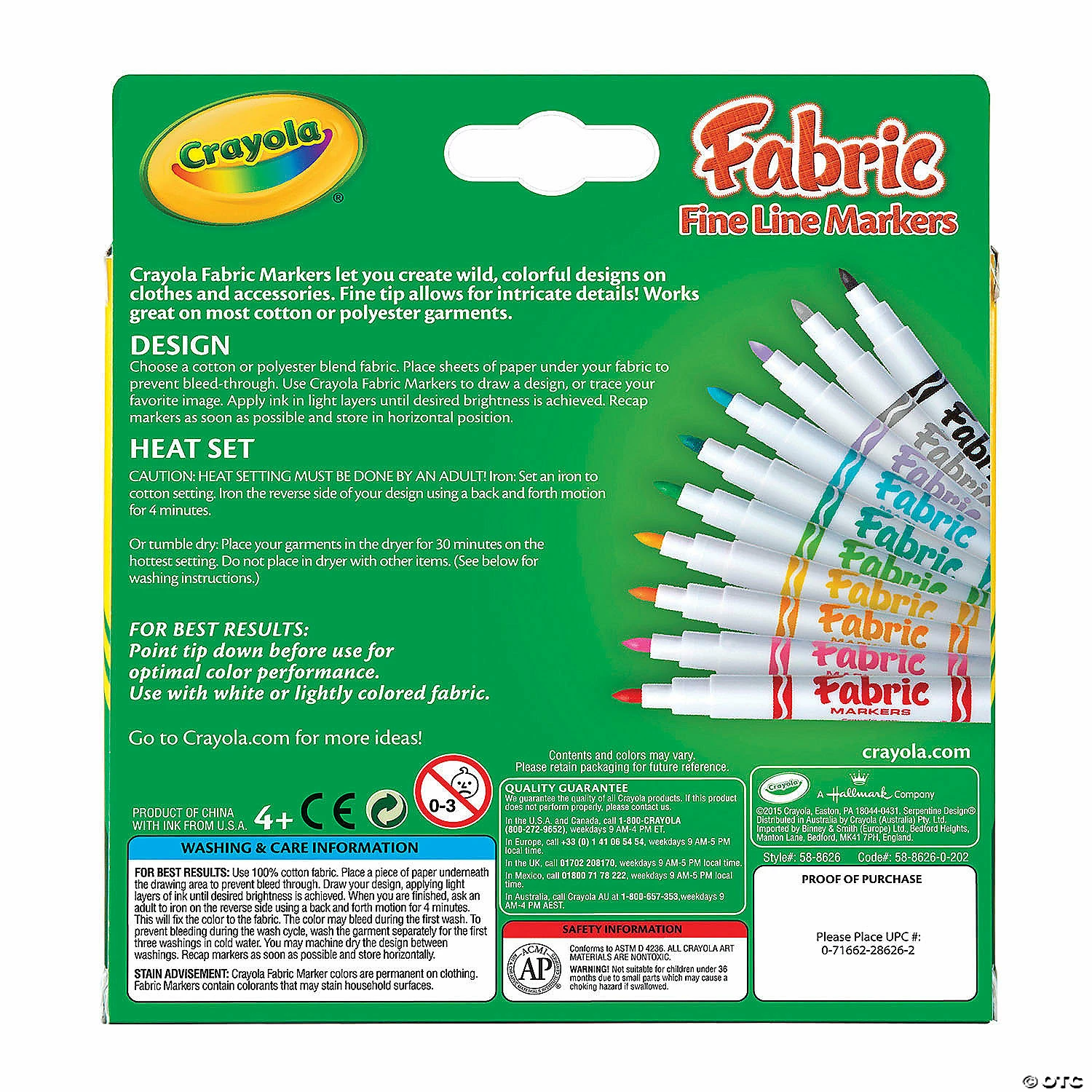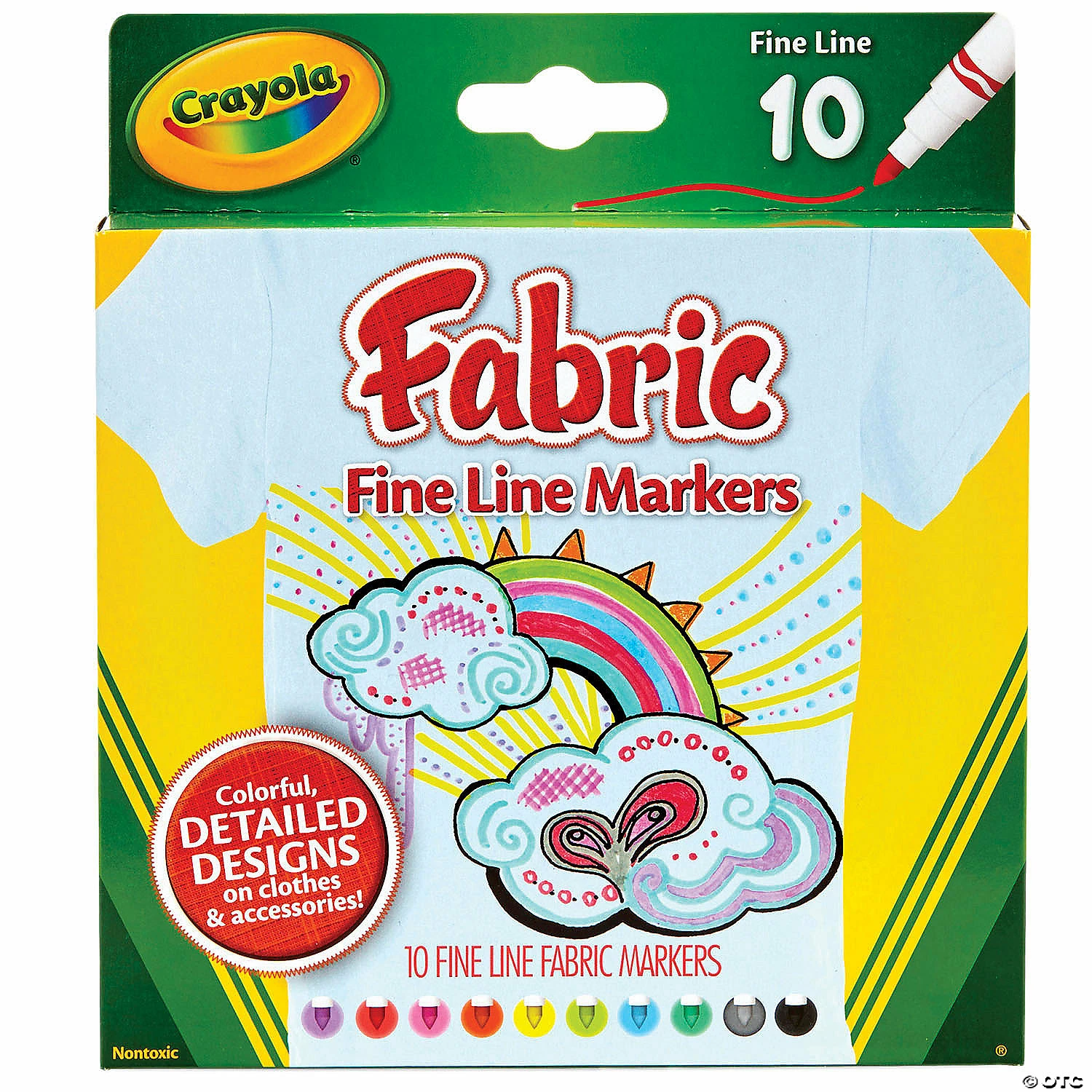 Crayola Fabric Markers let you create wild, colorful designs on clothes and accessories. Fine tip allows for intricate details! Works great on most cotton or polyester garments! Saturate the cloth with ink, then allow it to dry. Colored artwork is permanent and completely washable after heat-setting. Try these markers on T-shirts, tote bags, cloth napkins and placemats, hats and much more. AP Seal, non-toxic. Each pack includes 10 fine line Fabric Markers. Sold as 3 packs, 30 markers total.Β Β Special Shipping Information:Β This item ships separately from other items in your order.Β This item cannot ship to a P.O. Box.Β This item may be subject to additional processing days.Β Β Item is not eligible for expedited shipping.Β Β Β Β You may initiate a return for unused items within 30 days, if the items are in original packaging with all original materials included with the shipment.